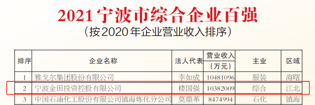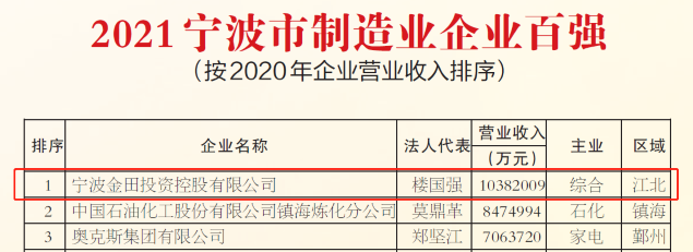 8月31日,宁波市发布“2021企业百强”等多个榜单,公司以优异的业绩名列前茅,荣登“宁波制造业企业百强”榜首、“宁波市综合企业百强”第2位。